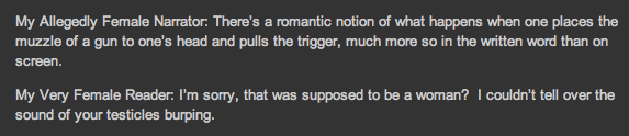 That aside, I agree it’s amusing that a guy who writes about giant horny alien grasshoppers finds writing from a female point-of-view beyond his ken, but let’s not mistake snark for critique. Calling Smith’s comments “othering” women – or accusing him of equating women with aliens – is reminiscent of those folks who make the “what will stop a guy from marrying his horse?” argument against supporting gay marriage; what you’re getting out of it is not what’s being put into it.