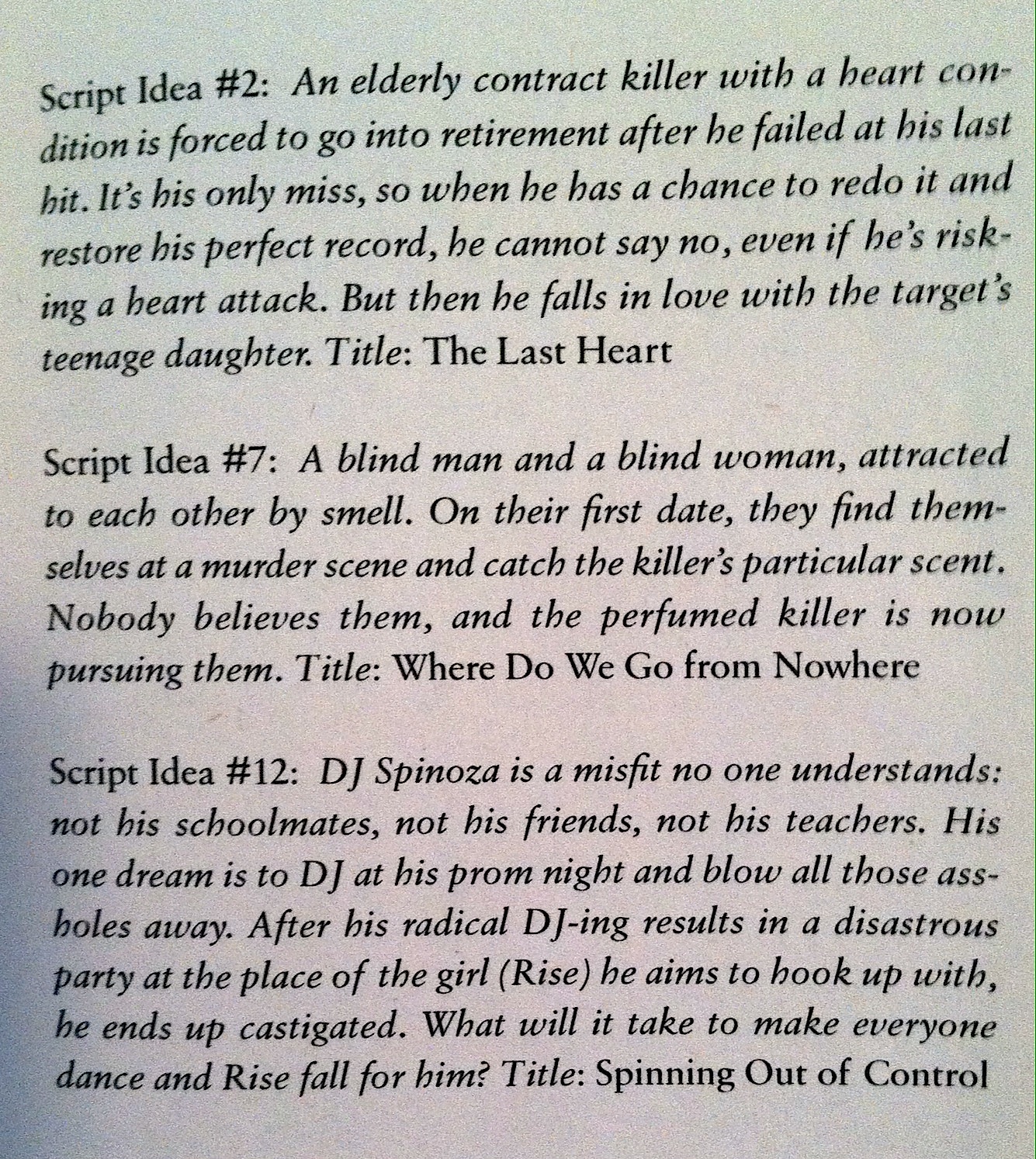 Actually, Hemon had me from the page before, a prologue where we get a summary of Script Ideas: