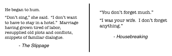 Let’s consider Ben Greenman’s The Slippage and Dan Pope’s Housebreaking, a pair of domestic-dude novels written two years apart (The Slippage came out two years ago and Housebreaking comes out today) and united by the fact that I happened to read them back-to-back. Fair warning if you don’t like spoilers, but there’s nothing ahead you wouldn’t find out if you read dust jackets.