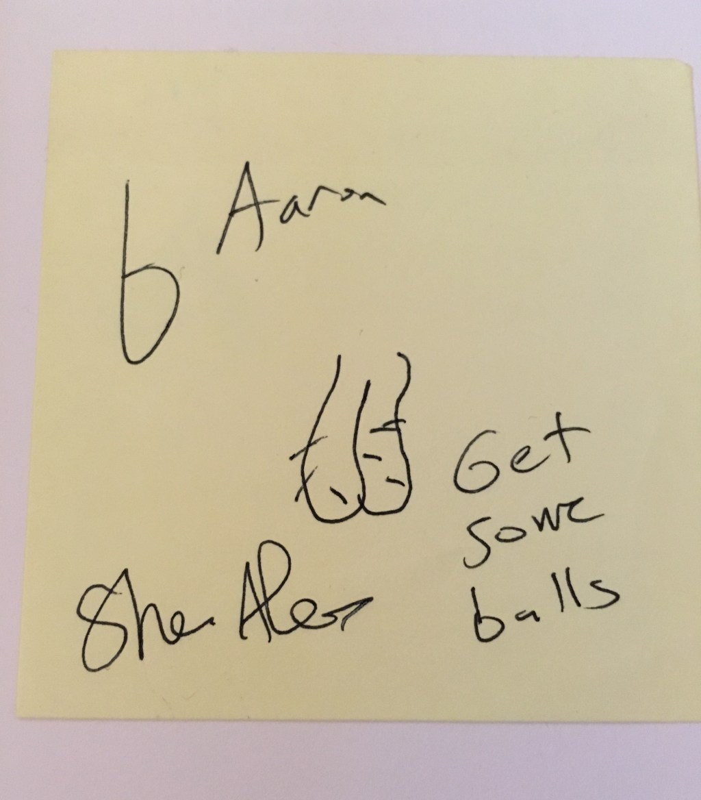 Alexie said, “There’s another Indian in the room?!?” He pulled one of the post-its that was being used for personalizations of the ARCs he was signing and drew the awesomeness you see above. Becky brought that post-it to where I sat, slapped it on the table in front of me, and said, “Sherman Alexie says ‘get some balls.’”